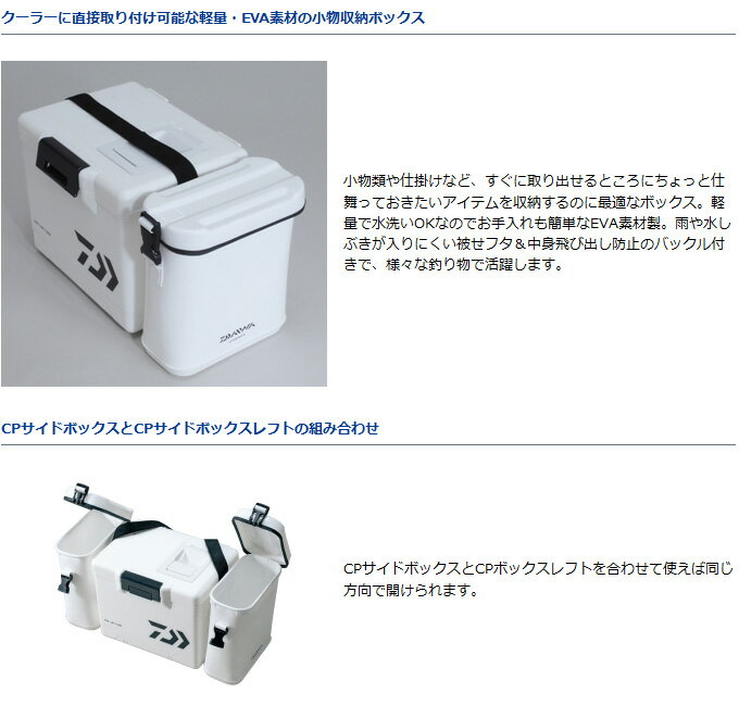 20160513-06メーカー名 ダイワ / DAIWA 商品名 CP サイドボックス 商品情報 クーラーに直接取り付け可能な軽量・EVA素材の小物収納ボックス 小物類や仕掛けなど、すぐに取り出せるところにちょっと仕舞っておきたいアイテムを収納するのに最適なボックス。