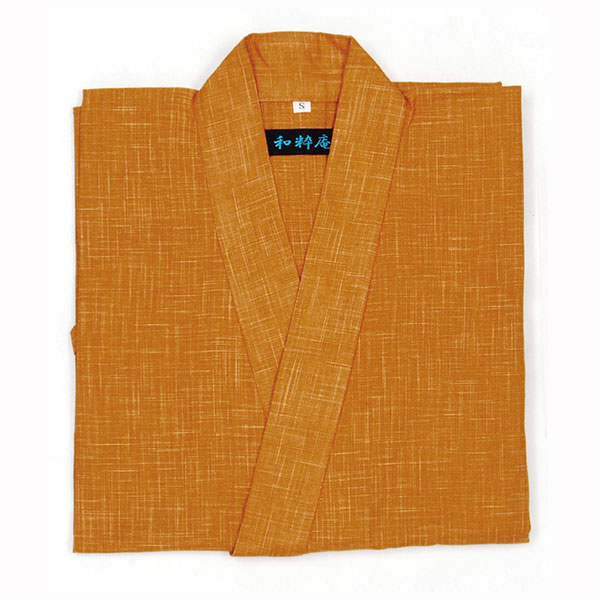 【 SS 】 身長:145〜155cm、上着丈:65cm、裄丈:62cm、ズボン総丈92cm、股下64cm、ウエスト55〜85cm 【 S 】 身長:150〜160cm、上着丈:70cm、裄丈:66cm、ズボン総丈94cm、股下65cm、ウエスト60〜92cm 【 M 】 身長:160〜170cm、上着丈:76cm、裄丈:71cm、ズボン総丈100cm、股下72cm、ウエスト64〜98cm 【 L 】 身長:170〜180cm、上着丈:80cm、裄丈:75cm、ズボン総丈104cm、股下74cm、ウエスト69〜106cm 【 LL 】 身長:180cm以上、上着丈:84cm、裄丈:78cm、ズボン総丈107cm、股下76cm、ウエスト77〜112cm ■仕様 上着:左前ポケット1個 ズボン:ウエスト後ろゴム前ボタン、共布紐、ファスナー付、ポケット左右各1個、裾共布紐仕様 素材:綿100% 洗濯方法:洗濯機(ネット使用) 製造:日本桐生産 絣紬 (かすりつむぎ) 作務衣 【 NO.16 オレンジ 】 桐生の作務衣職人がつくった 絣紬(かすりつむぎ)作務衣 全17色 TOPへ 絣紬 ( かすりつむぎ ) 作務衣 【 NO.16 オレンジ 】 桐生の作務衣職人が丁寧に仕上げた上質な作務衣。