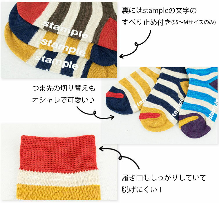 靴下 キッズ stample スタンプル スラブボーダークルーソックス 3足組 靴下 滑り止め 靴下 15cm 子供 すべり止め 靴下 履きやすい キッズ 子供用 子ども こども 女の子 男の子 保育園 幼稚園 靴下 ボーダー 靴下 70657 2020春 子供